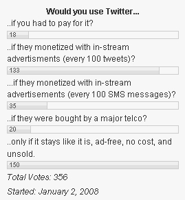 W temacie Twittera warto wspomnieć też ostatnie rozważania anglojęzycznej blogosfery na temat możliwych modelów biznesowych tego typu serwisów. Zaczęło się od artykułu na CenterNetworks i przeszło między innymi na Mashable, gdzie ukazała się ankieta badająca ten temat. Poniżej wyniki, których zrzut zrobiłem dzisiaj: